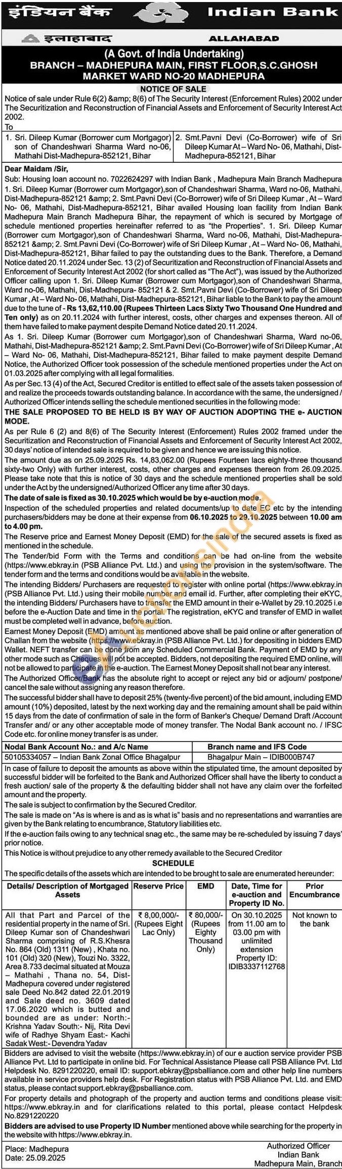 All that Part and Parcel of the residential property in the name of Sri. Dileep Kumar son of Chandeshwari Sharma comprising of R.S.Khesra No. 864 (Old) 1311 (New), Khata no. 101 (Old) 320 (New), Touzi No. 3322, Area 8.733 decimal situated at Mouza Mathahi, Thana no. 54, Dist-Madhepura covered under registered sale Deed No.842 dated 22.01.2019 and Sale deed no. 3609 dated 17.06.2020 which is butted and bounded are as under: North:-Krishna Yadav South:- Nij, Rita Devi wife of Radhye Shyam East:- Kachi Sadak West:- Devendra Yadav