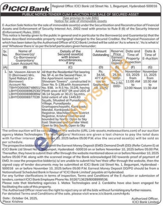 All that the Residential Flat bearing No. SF-4, on the Second Floor, in the Apartment named as Shivaram Tawers", constructed in Door No. 5-138 with Assessment . 938, in R.S No. 312/6, having Plinth orea of 837 Sft and UDS of totol extent of site 1445.83 Sqyds, Situated at Punadipadu Village, Punadipadu Gramapanchayathi, Kankipadu Mandal, Kankipadu Sub-Registrar, Machilipatnam District Registrar, Krishna District and bounded by North: Open to Sky East: Staircase and Corridor West Open to Sky South: Open to Sky