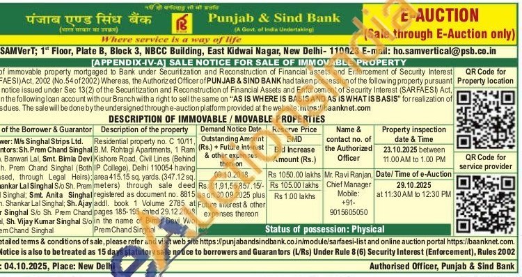 Residential property no. C 10/11, B.M. Rohtagi Apartments, 1 Ram Kishore Road, Civil Lines (Behind IP College), Delhi 110054 having-area 415.15 sq. yards. (347.12 sq. meters) through sale deed registered as document no. 8815 addl. book 1 Volume 2785 at pages 185-195 dated 29.12.2008 in the name of Bimla Devi W/o Prem Chand Singhal