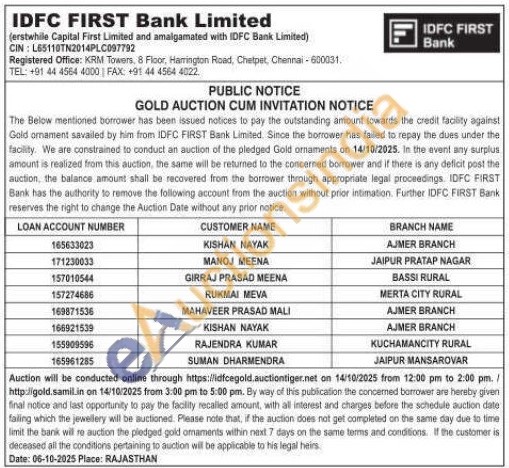 IDFC First Bank Ltd Gold Auctions Auction in Ajmer