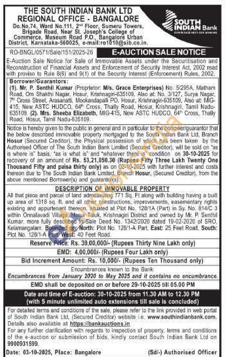 All that piece and parcel of land admeasuring 771 Sq. Ft along with building having a built up area of 1318 sq. ft. and all other constructions, improvements, easementary rights existing and appurtenant thereon, situated at Plot No. 128/1A (Part) in Sy. No. 814/C 3 within Onnalavadi Village, Hosur Taluk, Krishnagiri District and owned by Mr. P. Senthil Kumar, more fully described in Sale Deed No. 1342/2020 dated 19-02-2020 of SRO, Kelamangalam. Bounded on: North: Plot No. 128/1-A Part, East: 25 Feet Road, South: Plot No. 128/1-A Part, West: 40 Feet Road.