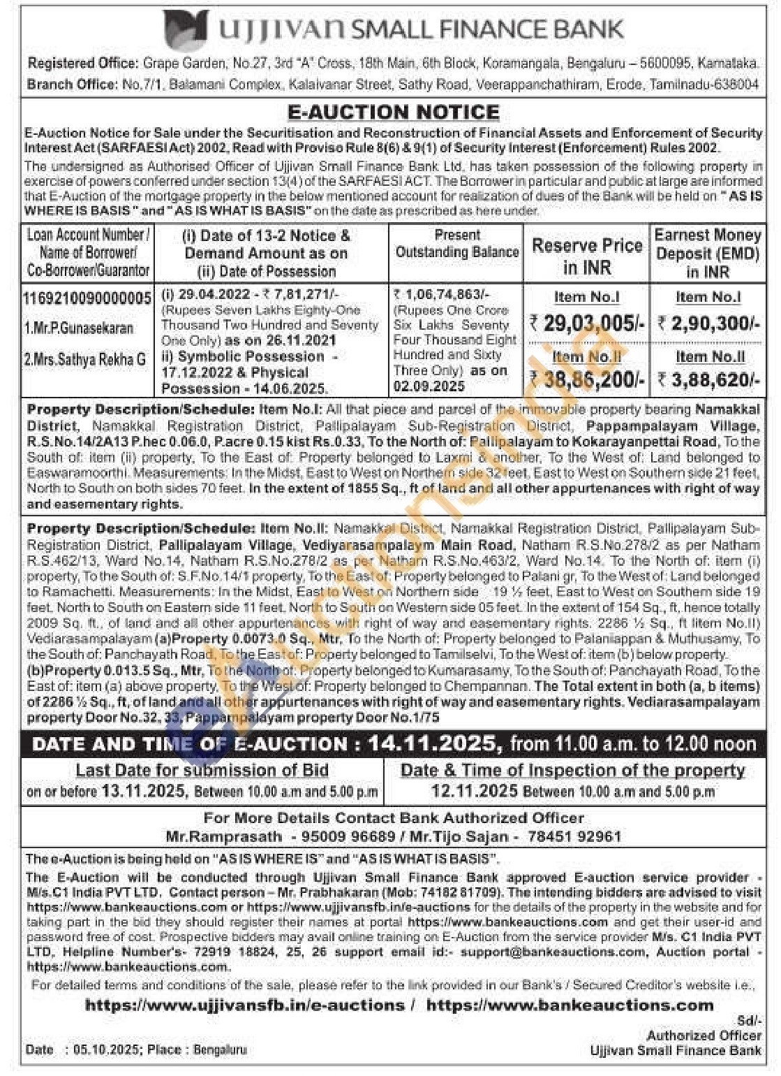 Authorized Officer Mr.Ramprasath 95009 96689/ Mr.Tijo Sajan 78451