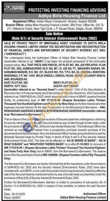 ALL THAT PIECE AND PARCEL OF PLOT NO. 366, (AS PER APVD. PLAN PLOT NO. 284), ADMEASURING 39.01 SQ. MT. I.E. 420 SQ. FT., MAHADEV NAGAR, NR. HANUMAN MANDIR, R.S. NO. 351, BLOCK NO. 510, T.P.S. NO. 62, (DINDOLI-BHESTAN-BHEDWAD), F.P. NO. 143/F, MOJE DINDOLI, DINDOLI ROAD, SURAT, GUJARAT-394210, AND, BOUNDED AS: