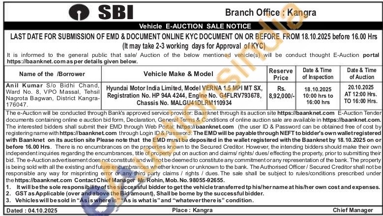 Hyundai Motor India Limited, Model VERNA 1.5 MPI MT SX, Registration No. HP 94A 4244, Engine No. G4FLRV793678, Chassis No. MALGU41DLRM110934