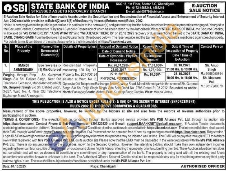 Residential Property measuring 128 Sq. Yd Property No. 8014/00184 situated at Ward No. 6 Opposite Old Telephone Exchange, Near Channa Road, Mandi Ahmedgarh in the name of Sh. Gurpreet Singh S/o Sh. Daljit Singh Singh Vide Sale Deed No. 2798 Dated 21.03.2012. Bounded as under North: Passage; South: Mishra, East: Kuldeep Singh Garcha; West: Meena Verma