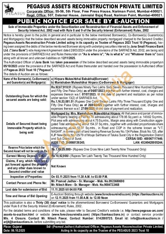 Mortgaged by: Mrs. Manishaben Mukeshbhai Hirpara: All that piece and parcel of immov-able Property bearing a Plot No.79 admeasuring about 178.95 Sq yard i.e. 149.62 Sq.mtrs., Plot area with admeasuring about 4.75 Sq.mtrs., Margin area along with Construction aggregated Total admeasuring about 154.37 Sq.mtrs., together with undivided proportionate share admeasuring about 53.07 Sq.mtrs., in Road and COP in the scheme known as "V.T. NAGAR", in forming part of land bearing Revenue Survey No. 134 Paikee, Block No. 125, after KJP New Block No. 125/79 of Mouje Sarthana of Taluka Surat City in the Registration District