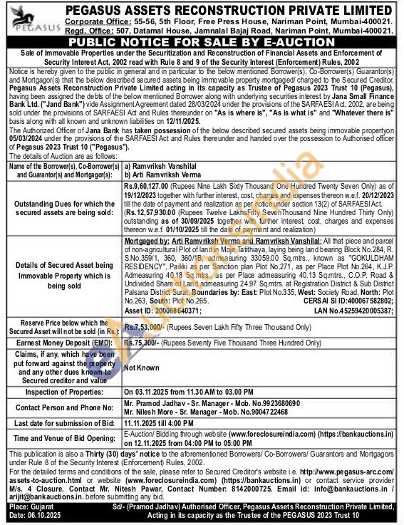 Mortgaged by: Arti Ramvriksh Verma and Ramvriksh Vanshilal: All that piece and parcel of non-agricultural Plot of land in Moje Tatithiaya, laying being land bearing Block No.284, R. S.No.359/1, 360, 360/1B, admeasuring 33059.00 Sq.mtrs., known as "GOKULDHAM RESIDENCY", Paikki as per Sanction plan Plot No.271, as per Place Plot No 264, K.J.P. Admeasuring 40.18 Sq.mtrs., as per Place admeasuring 40.13 Sqmtrs., C.O.P. Road & Undivided Share of Land admeasuring 24.97 Sq.mtrs. at Registration District & Sub District Palsana District Surat. Boundaries by: East: Plot No.335, West: Society Road, North: Plot No.263, South: Plot No.265.