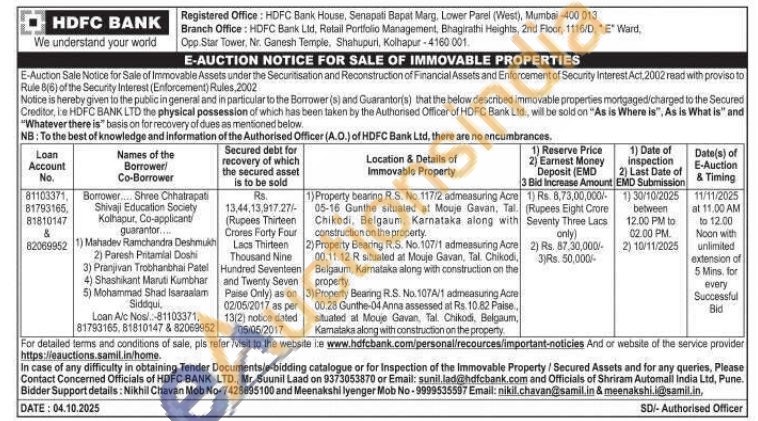 Property bearing R.S. No. 117/2 admeasuring Acre 05-16 Gunthe situated at Mouje Gavan, Tal. Chikodi, Belgaum, Karnataka along with construction on the property. 2) Property Bearing R.S. No. 107/1 admeasuring Acre 00.11.12 R situated at Mouje Gavan, Tal. Chikodi, Belgaum, Karnataka along with construction on the property. 3) Property Bearing R.S. No. 107A/1 admeasuring Acre 00.28 Gunthe-04 Anna assessed at Rs. 10.82 Paise.. situated at Mouje Gavan, Tal. Chikodi, Belgaum, Kamataka along with construction on the property