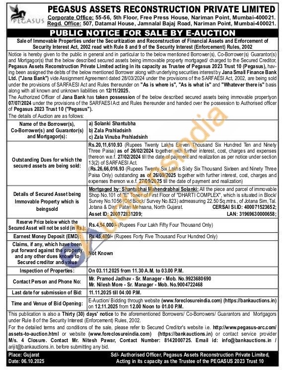 Mortgaged by: Shantubhai Mahendrabhai Solanki: All the piece and parcel of immovable Shop No. 101 of "E" Tower of First Floor of "DHARTI COMPLEX", which is situated in Block/Survey No.1056 (Old Block/ Survey No.823) admeasuring 22.50 Sq.mtrs., of Jotana Sim, Tal. Jotana & Dist. Patan Mehsana, North Gujarat.
