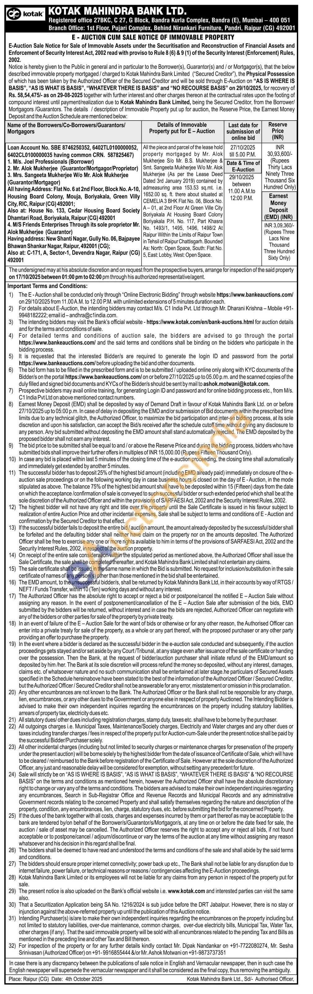All the piece and parcel of the lease hold property mortgaged by Mr. Alok Mukherjee S/o Mr. B.S. Mukherjee & Smt. Sangeeta Mukherjee W/o Mr. Alok Mukherjee (As per the Lease Deed Dated 3rd January 2019) contained by admeasuring area 153.53 sq.mt. i.e. 1652.00 sq. ft. there about situated at CEMELIA 3 BHK Flat No. 06, Block No. A-01, at 2nd Floor At Green Ville City Boriyakala At Housing Board Colony Boriyakala P.H. No. 117, Part Khasra No. 1493/1, 1495, 1496, 1498/2 At Raipur Within the Limits of Raipur Town in Tehsil of Raipur Chattisgarh. Bounded As: North: Open Space, South: Flat No. 5, East: Lobby, West: Open Space.