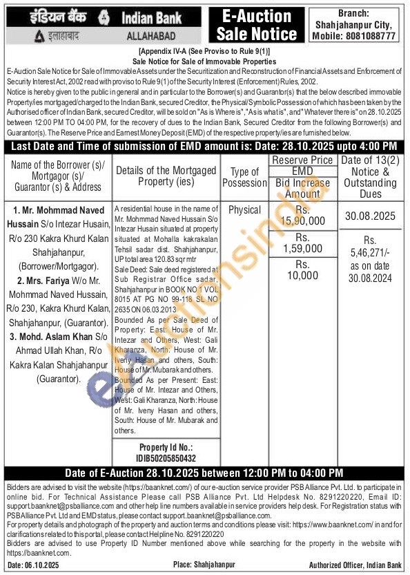 A residential house in the name of Mr. Mohmmad Naved Hussain S/o Intezar Husain situated at property situated at Mohalla kakrakalan Tehsil sadar dist. Shahjahanpur, UP total area 120.83 sqr mtr Sale Deed: Sale deed registered at Sub Registrar Office sadar, Shahjahanpur in BOOK NO 1 VOL 8015 AT PG NO 99-118 SL NO 2635 ON 06.03.2013