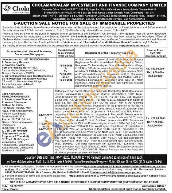 All that piece and parcel of land and building In Coimbatore North Registration District, Vadavalli Sub Registration District, Coimbatore North Taluk, Goundampalayam Village, in S.F.No.378, As per new Sub Division S.F.No.378/1A1, Sri Vari Gardens". Plot Nos.48 & 49, measuring an extent of 3250 Sq. feet (or) 7 cent 200 Sq.ft (301.93 Sq.Mt) with in the following boundaries and Measurements, Boundaries for the properties in Plot No. 48 measuring an extent of 1636 Sqft (or) 3 cent 329 Sq.ft. North of 20ft width East West Layout Road, South of properties in S.F.No.380 and 382, East of: properties in Plot No.49, West of properties in Plot No.47. Measurements: East West on the North side 35.0". East West on the South side 35.0", North South on the East side 47.0", North South on the west side 46'6", Boundaries for the properties in Plot No.49 measuring an extent of 1614 Sqft (or) 3 cent 307 Sq.ft. North of: 20ft width East West Layout Road, South of properties in S.F.No.380, West of properties in Plot No.48, East of properties in Plot No.50, Measurements: East West on the North side 35' 0", East West on the South side 35.0", North South on the East side 46.6", North South on the west side 45'9". Along with RCC building, Door No.33A, Old Tax assessment Nos. 162/614693, 162/614694, New Tax assessment Nos. 162/016/906996, 162/016/906997, Old water connection No.162/610486, 162/610487, New water connection Nos. 162/016/902320, 162/016/902319, Service connection No.03-101-004-297, 03-101-004-298, Mamool Pathway, cart track rights and all other appurtenances attached there to