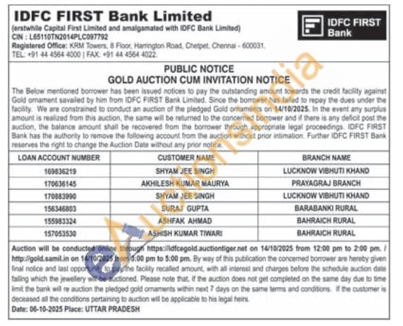 IDFC First Bank Ltd Gold Auctions Auction in Lucknow