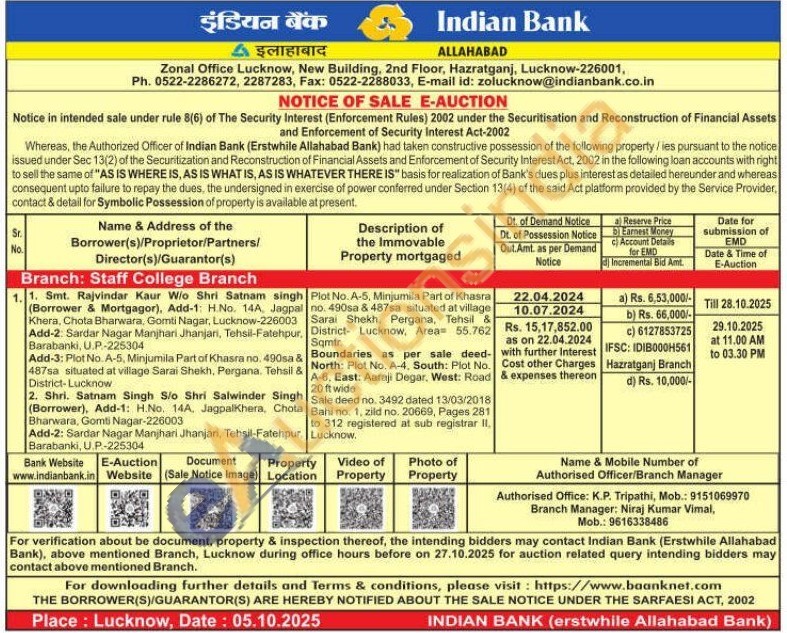 Plot No. A-5, Minjumila Part of Khasra no. 490sa & 487sa situated at village Sarai Shekh, Pergana, Tehsil & District- Lucknow, Area 55.762 Sqmtr