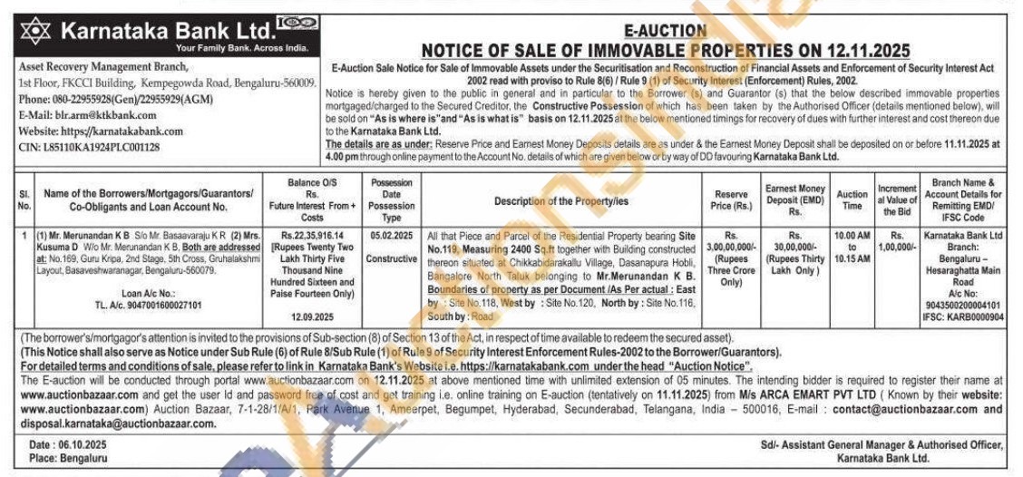 All that Piece and Parcel of the Residential Property bearing Site No.119, Measuring 2400 Sq.ft together with Building constructed thereon situated at Chikkabidarakallu Village, Dasanapura Hobli Bangalore North Taluk belonging to Mr.Merunandan K B. Boundaries of property as per Document (As Per actual: East by Site No.118, West by: Site No. 120, North by: Site No.116. South by: Road