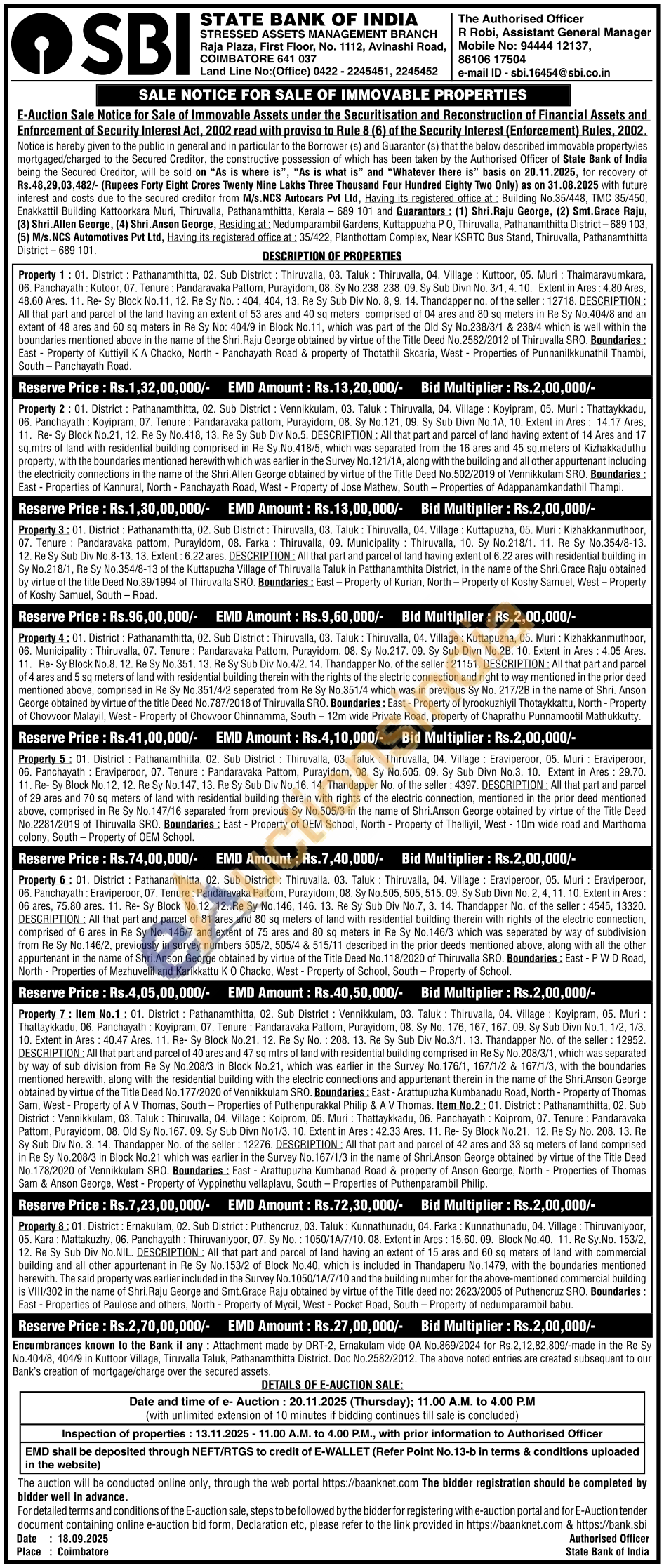 Item No.1: 01. District: Pathanamthitta, 02. Sub District: Vennikkulam, 03. Taluk: Thiruvalla, 04. Village: Koyipram, 05. Muri Thattaykkadu, 06. Panchayath: Koyipram, 07. Tenure: Pandaravaka Pattom, Purayidom, 08. Sy No. 176, 167, 167. 09. Sy Sub Divn No.1, 1/2, 1/3 10. Extent in Ares: 40.47 Ares. 11. Re- Sy Block No.21. 12. Re Sy No.: 208. 13. Re Sy Sub Div No.3/1. 13. Thandapper No. of the seller: 12952 DESCRIPTION: All that part and parcel of 40 ares and 47 sq mtrs of land with residential building comprised in Re Sy No.208/3/1, which was separated by way of sub division from Re Sy No.208/3 in Block No.21, which was earlier in the Survey No.176/1, 167/1/2 & 167/1/3, with the boundaries mentioned herewith, along with the residential building with the electric connections and appurtenant therein in the name of the Shri. Anson George obtained by virtue of the Title Deed No.177/2020 of Vennikkulam SRO. Boundaries: East-Arattupuzha Kumbarnadu Road, North-Property of Thomas Sam, West - Property of A V Thomas, South-Properties of Puthenpurakkal Philip & AV Thomas. Item No.2: 01 District: Pathanamthitta, 02. Sub District: Vennikkulam, 03. Taluk: Thiruvalla, 04. Village: Koiprom, 05. Muri: Thattaykkadu, 06. Panchayath: Koiprom, 07. Tenure: Pandaravaka Pattom, Purayidom, 08. Old Sy No. 167. 09. Sy Sub Divn No1/3, 10. Extent in Ares: 42.33 Ares. 11. Re- Sy Block No.21. 12. Re Sy No. 208. 13. Re Sy Sub Div No. 3. 14. Thandapper No. of the seller: 12276, DESCRIPTION: All that part and parcel of 42 ares and 33 sq meters of land comprised in Re Sy No.208/3 in Block No.21 which was earlier in the Survey No. 167/1/3 in the name of Shri Anson George obtained by virtue of the Title Deed No.178/2020 of Vennikkulam SRO. Boundaries: East Arattupuzha Kumbanad Road & property of Anson George, North Properties of Thomas Sam & Anson George, West-Property of Vyppinethu vellaplavu, South Properties of Puthenparambil Philip