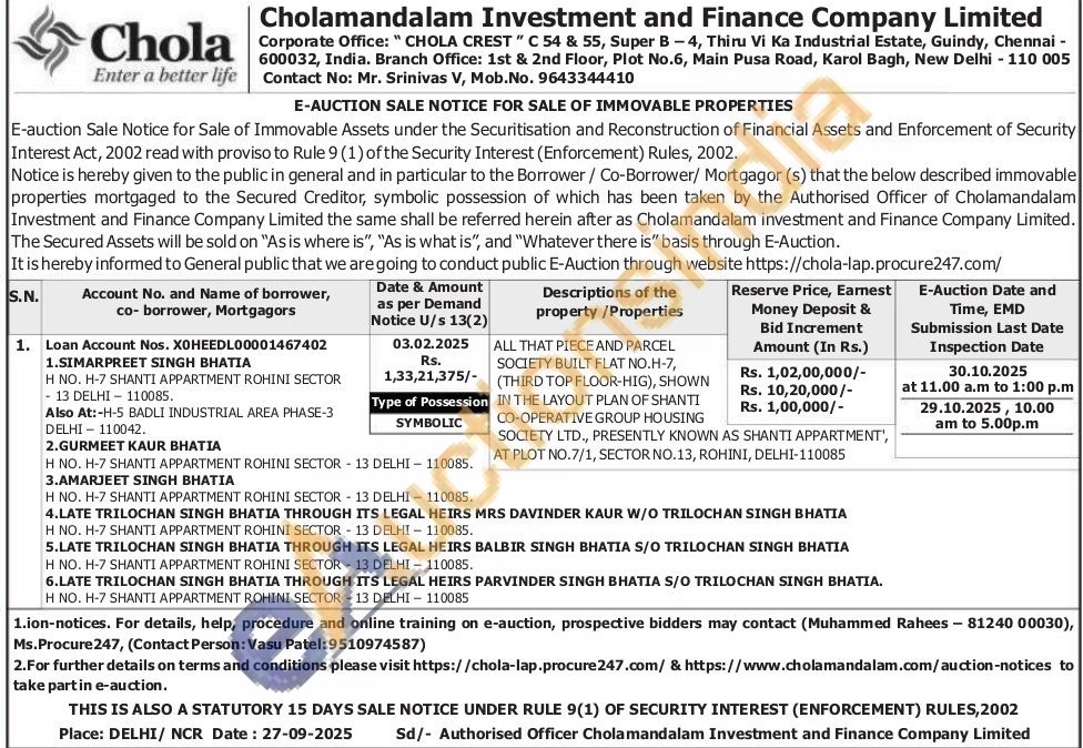 ALL THAT PIECE AND PARCEL SOCIETY BUILT FLAT NO.H-7, (THIRD TOP FLOOR-HIG), SHOWNIN THE LAYOUT PLAN OF SHANTI CO-OPERATIVE GROUP HOUSING SOCIETY LTD., PRESENTLY KNOWN AS SHANTI APPARTMENT', AT PLOT NO.7/1, SECTOR NO.13, ROHINI, DELHI-110085