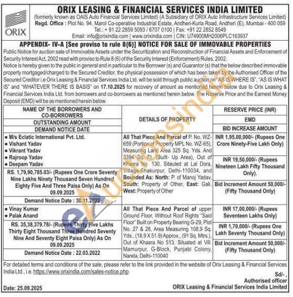 All That Piece And Parcel of P. No. WZ-659 (Portion of Property MPL No. WZ-65), Measuring Land Area 325 Sq. Yds. And 3394 Sq. Ft. (Built Up Area), Out of Khasra No. 130, Sitauted at Lal Dora. Village-Shakurpur, Delhi-110034, and Bounded As: North: P. of Manoj Yadav, South: Property of Other, East: Gali, West: Property of Other