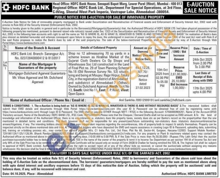 Shop no 12 admeasuring 70 sq yards in a scheme known as Hirabhai Market of the Gujarat Cloth Dealers Co Op Shops and Warehouses Soc Ltd constructed in the Land of Final Plot no. 29 of Town Planning Scheme No.18 (Old Revenue Survey No. 53) situate, lying and being at Moujeu: Rajpr Hirpur, Taluka City, in the registration district of Ahmedabad and subdistrict of Ahmedabad-7 (Odhav). Owned by Dulichand Agarwal. North: Unit No 13, South: Unit No 11, East: T. P. Road, West: Open Space