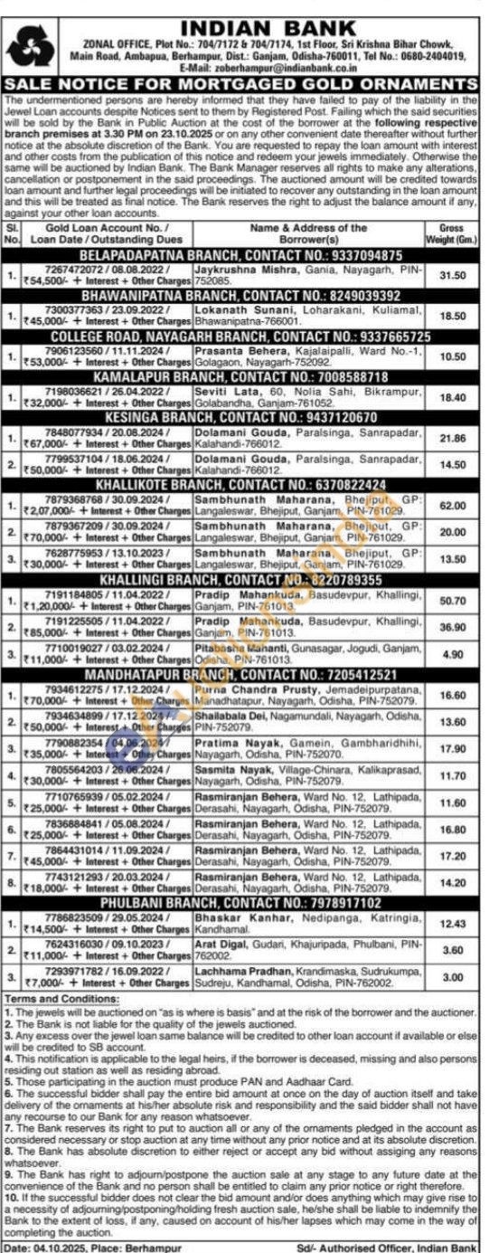 Indian Bank Gold Auctions Auction in Nayagarh