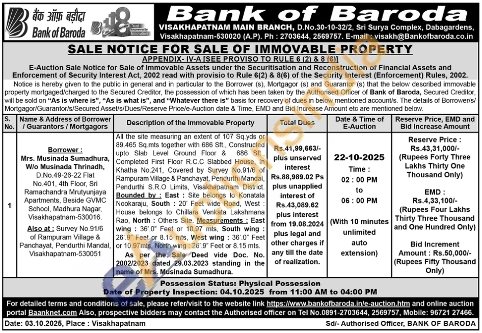 All the site measuring an extent of 107 Sq.yds or 89.465 Sq.mts together with 686 Sft., Constructed upto Slab Level Ground Floor & 686 Sft., Completed First Floor R.C.C Slabbed House, In Khatha No.241, Covered by Survey No.91/6 of Rampuram Village & Panchayat, Pendurthi Mandal, Pendurthi S.R.O Limits, Visakhapatnam District. Bounded by: East: Site belongs to Konatala Nookaraju, South: 20 Feet wide Road, West: House belongs to Chillara Venkata Lakshmana Rao, North: Others Site. Measurements: East wing: 36.0 Feet or 10.97 mts, South wing: 26.9" Feet or 8.15 mts, West wing: 36.0" Feet or 10.97mts, North wing: 26.9" Feet or 8.15 mts.