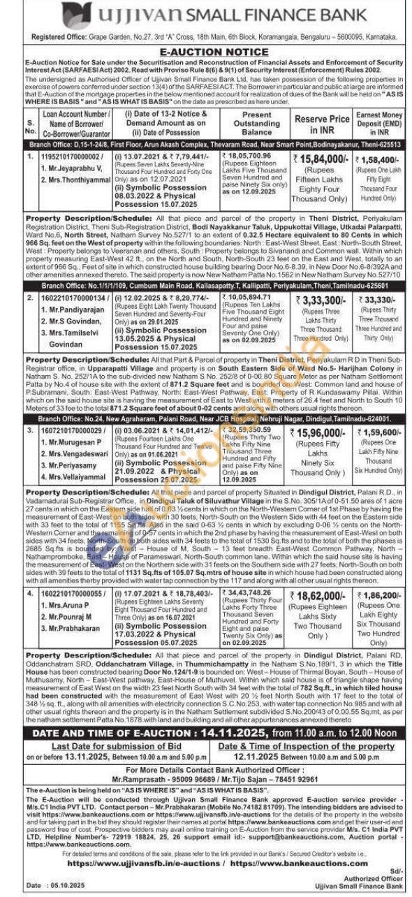 Property Description/Schedule: All that piece and parcel of the property in Theni District, Periyakulam Registration District, Theni Sub-Registration District, Bodi Nayakkanur Taluk, Uppukottai Village, Utkadai Palarpatti, Ward No., North Street, Natham Survey No.527/1 to an extent of 0.32.5 Hectare equivalent to 80 Cents in which 966 Sq. feet on the West of property within the following boundaries North East-West Street, East: North-South Street, West: Property betongs to Veeranan and others, South Property belongs to Sivanandi and Common wall. Within which property measuring East-West 42 ft on the North and South, North-South 23 feet on the East and West, totally to an extent of 566 5q. Feet of site in which constructed house building building bearing bearing De Door No.6-8.39, in New Door No. 6-8/392A and cither amenities annexed therels. The said property is now New Natham Patta No. 1562 in New Natham Survey No.527/10