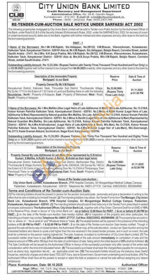 1) Kanyakuman Distict, Kalkulam Taluk, Thiruvattar Sub District, Thumbacode Village, Re Sy No: 177/3 to the Extent of 7.00 Cents of Land and Building there on with the following Boundaries North: Property of Kolappan, East: Property of Maheswar, West: Road, South: Property of Velappan