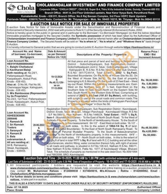2) Registration District: Gobichettipalayam, Sub Registration District: Kavindapadi, District: Erode, Taluk: Bhavani, Village/Panchayat Kavindapadi Village, R.S.No SF No. 590/11, New Natham R.S.No. 1446/24, Total Extent: 1177 Sq.ft. Item-1: Bounded Boundaries: To the East of North South Road, To the West of Sulikadu Perumal Property, To the North of Venkittusamy House; To the South of Murthy property. In this measurement: 64-1/2-East West on both sides 16-1/2-North South on both sides. In this to the extent of 1064-1/4 Sq. ft of land. Item-2: Bounded Boundaries:- To the East of North South Ramasamy Road, To the West of Perumal Mudaliar Property: To the South of Balasubramanian - Property: To the North of Venkittusamy property. In this measurements: 64'6" East West on both sides, 19-North South on both sides, In this to the extent of 113 Sq.lt of land in total 1177 % Sq. ft of land with R.C.C building and all the other appurtenances, electric fitting, water connection thereon fully, with right of access to all roads and pathway, is situated in S.F.No 126 A/2, Natham R.S.No. 590/11, New Natham R.S.No. 1446/24, Patta No. 1077 of Kavindapadi Village, Bhavani Taluk. The schedule of property as mentioned in the sale deed Doct. No:809/1994 and 768/2006, SRO, Kavindapadi.