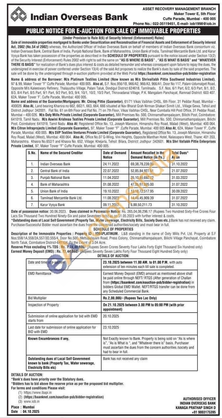 DL&B standing in the name of Ooty Mills Pvt. Ltd. Property at S.F Nos: 558/1A,588/24.557/30 5554. Door No.500, Mettupalayam Road, Press Colony, Chinnamathampalayam, Blichi Village Panchayat, Coimbatore North Taluk, Coimbatore District-641104. To the Extent of 3.04 Acre