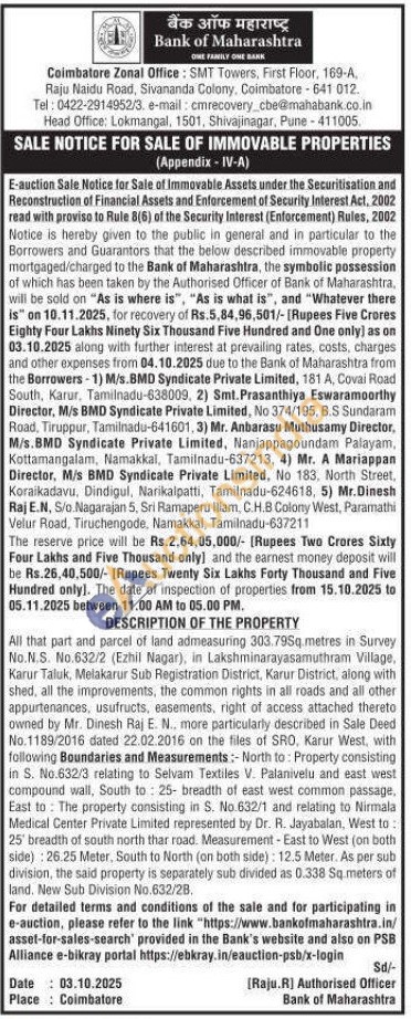 All that part and parcel of land admeasuring 303 79Sq metres in Survey No.N.S. No.632/2 (Ezhil Nagar), in Lakshminarayasamuthram Village, Karur Taluk, Melakarur Sub Registration District, Karur District, along with shed, all the improvements, the common rights in all roads and all other appurtenances, usufructs, easements, right of access attached thereto owned by Mr. Dinesh Raj E. N., more particularly described in Sale Deed No.1189/2016 dated 22.02.2016 on the files of SRO, Karur West, with following Boundaries and Measurements: North to Property consisting in S. No.632/3 relating to Selvam Textiles V. Palanivelu and east west compound wall, South to 25- breadth of east west common passage, East to The property consisting in S. No.632/1 and relating to Nirmala Medical Center Private Limited represented by Dr. R. Jayabalan, West to: 25 breadth of south north thar road. Measurement - East to West (on both side): 26.25 Meter. South to North (on both side): 12.5 Meter. As per sub division, the said property is separately sub divided as 0.338 Sq.meters of land. New Sub Division No.632/28.