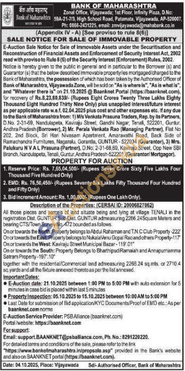 All those pieces and parcels of land situate being and lying at village TENALI in the registration Dist. GUNTUR Sub-Dist. GUNTUR admeasuring 2266 24Square Meters and bearing CTS/Town Survey No. 472 bounded as follows.On or towards the North: Property belongs to Abdul Rahaman and T.N.C Club Property-222 On or towards the East: Property belongs to Nukala Venu Gopal Rao and others Property-117 On or towards the West: Kaviraju Street Municipal Bazar-11901"