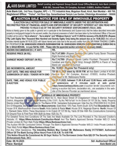 All That Residential Property Situated At Ward No.13, Main Bazar Street Of Chagalamari Village & Mandal, Nandyal District, Allagadda Sub Registration Bearing D.No. 13-81, Sy No.746/talabt In An Extent Of 137.58 Sq. Yards. Property Stands Under Regd. Partition Deed In The Name Of Mir Vankadara Subramanyam Vide Doc No.3702/2009 Dt 2.12.2009 Sro Of Allagadda, Being Bounded On Measurements: East-West: 19% Feet, North-South: 63% Feet Boundaries: East: House Of K. Madhusudhan Sharma South: Kota Gadda & Rasta West: House Of K. Nagaraja Sharma North: House Of V. Ramesh Babu Within These Boundaries in An Extent Of 137.58 Sq. Yards Of Site With Roc Constructions Consisting Of Ground Floor & First Floor With Built Up Ares 1620 Sq. FL