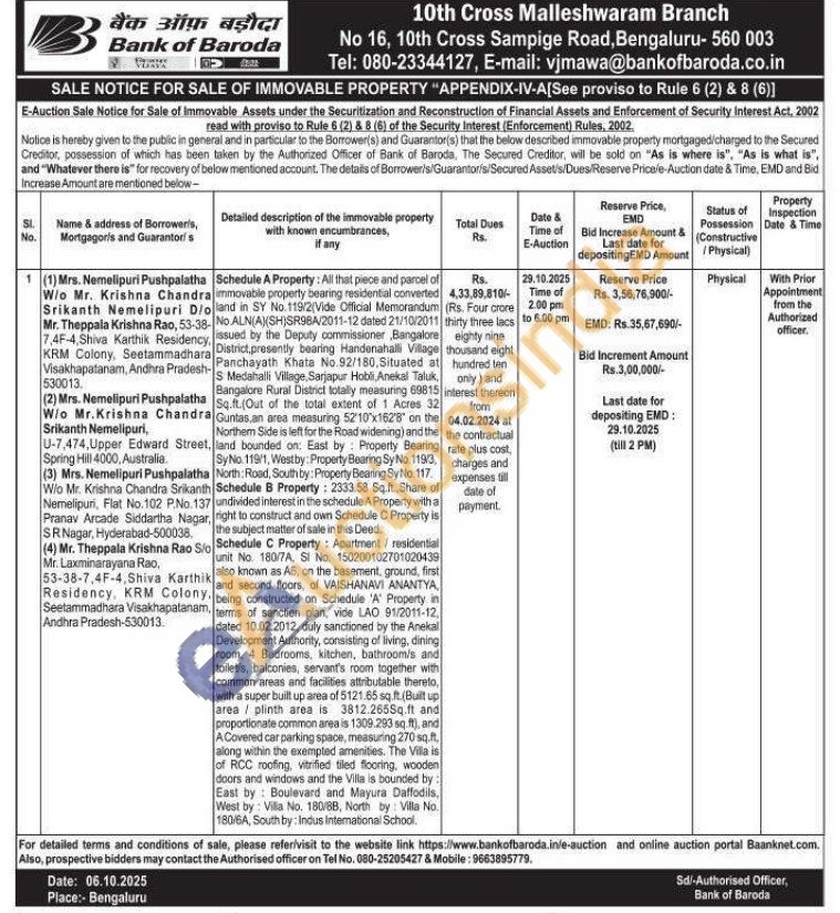 All that piece and parcel of immovable property bearing residential converted land in SY No.119/2(Vide Official Memorandum - No.ALN(A)(SH)SR98A/2011-12 dated 21/10/2011 , issued by the Deputy commissioner, Bangalore District, presently bearing Handenahalli Village - Panchayath Khata No.92/180, Situated at S Medahalli Village, Sarjapur Hobli, Anekal Taluk, Bangalore Rural District totally measuring 69815 Sq.ft. (Out of the total extent of 1 Acres 32 Guntas an area measuring 52'10'x1628" on the Northem Side is left for the Road widening) and the , land bounded on: East by Property Bearing Sy No. 119/1, Westby: Property Bearing Sy No. 119/3 North: Road, South by: Property Bearing Sy No. 117Schedule B Property: 2333.58 Sq.ft., Share of undivided interest in the schedule A Property with right to construct and own Schedule C Property is the subject matter of sale in this Deed. Schedule C Property: Apartment/residential unit No. 180/7A, SI No. 150200102701020439 also known as A6, on the basement, ground, first and second floors, of VAISHANAVI ANANTYA, being constructed on Schedule 'A' Property in terms of sanction plan, vide LAO 91/2011-12, dated 10.02.2012, duly sanctioned by the Anekal Development Authority, consisting of living, dining room, 4 Bedrooms, kitchen, bathroom/s and toilet's, balconies, servant's room together with common areas and facilities attributable thereto, with a super built up area of 5121.65 sq.ft. (Built up area/ plinth area is 3812.265Sq.ft and proportionate common area is 1309.293 sq.ft), and A Covered car parking space, measuring 270 sq.ft. along within the exempted amenities. The Villa is of RCC roofing, vitrified tiled flooring, wooden doors and windows and the Villa is bounded by: East by Boulevard and Mayura Daffodils, West by: Villa No. 180/88, North by Villa No. 180/6A, South by: Indus Intemational School