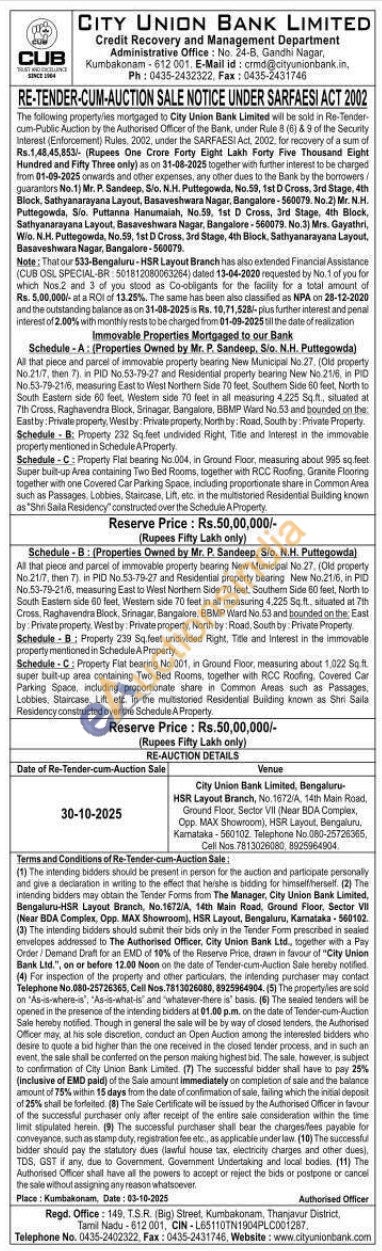 Schedule-A: (Properties Owned by Mr. P. Sandeep, Slo. N.H. Puttegowda) All that piece and parcel of immovable property bearing New Maniopal No. 27. (Old property No.21/7, then 7). in PID No.53-79-27 and Residential property bearing New No 2170, in PIO No.53-79-21/6, measuring East to West Northern Side 70 feet. Southerm Side 60 feet North South Eastern side 60 feet, Westem side 70 feet in all measuring 4.225 Sqft., scated at 7th Cross, Raghavendra Block, Srinagar, Bangalore, BBMP Ward No. 53 and bounded on the Eastby: Private property, Westby Private property, North by: Road, South by Private Property