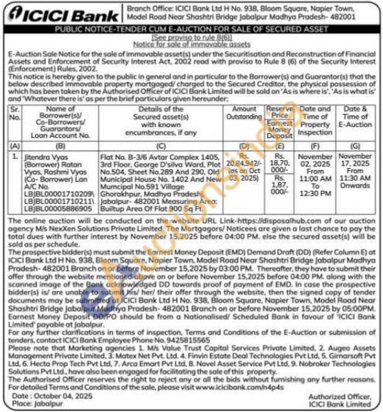 Flat No. B-3/6 Avtar Complex 1405, 3rd Floor, George D'silva Ward, Plot No.504, Sheet No.289 And 290, Old Municipal House No. 1402 And New Mumcipal No.591 Village Ghorakhpur, Madhya Pradeshj. Jabalpur-482001 Measuring Area: Builtup Area Of Flat 900 Sq Ft.