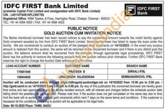 IDFC First Bank Ltd Gold Auctions Auction in Chennai