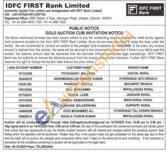 IDFC First Bank Ltd Gold Auctions Auction in Chennai