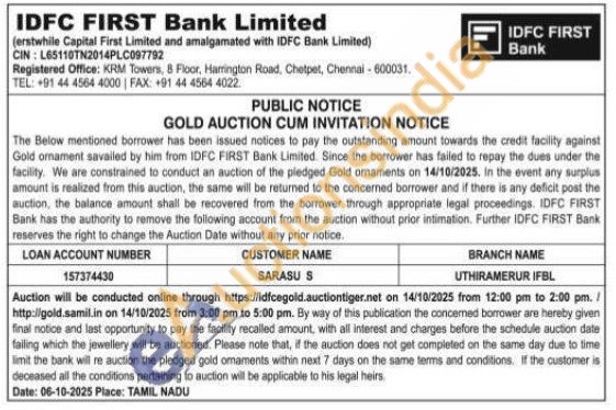 IDFC First Bank Ltd Gold Auctions Auction in Chennai