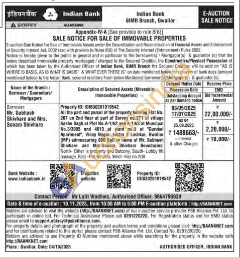 All the part and parcel of the property bearing Flal No. 207 on 2nd floor at part of Survey no.271 of village Kesho Bagh at Plot No.A-1/62 and A-1/53 at Muncipal No.3/3005 4013 "Gurukul Apartment, Vinay Nagar, sector 3 Lashkar, Gwalior (MP) admeasuring 800 Sqft in name of Mr. Subhash Shivhare and Mrs. Sonam Shivhare Boundaries: North- Other 's property and Balcony, South- Lobby lift passage, East -Flat No.206, West- Rat no.208