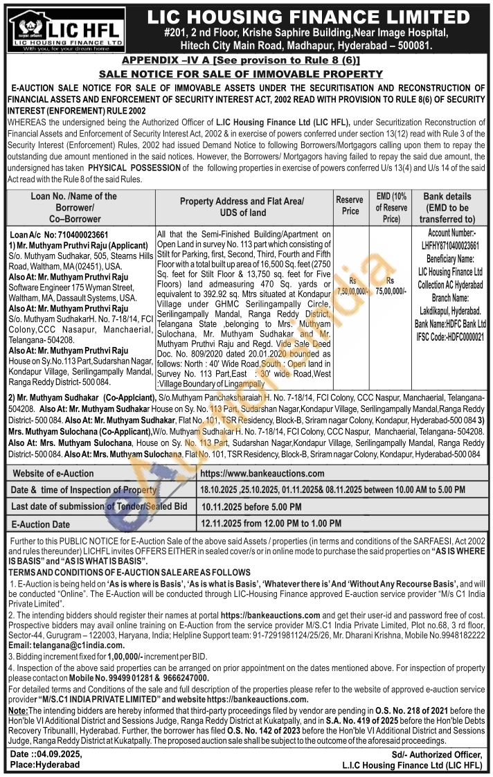 All that the Semi-Finished Building/Apartment on Open Land in survey No. 113 part which consisting of Stilt for Parking, first, Second, Third, Fourth and Fifth Floor with a total built up area of 16,500 Sq. feet (2750 Sq. feet for Stilt Floor & 13,750 sq. feet for Five Floors) land admeasuring 470 Sq. yards or equivalent to 392.92 sq. Mtrs situated at Kondapur Village under GHMC Serilingampally Circle, Serilingampally Mandal, Ranga Reddy District, Telangana State belonging to Mrs. Muthyam Sulochana, Mr. Muthyam Sudhakar and Mr. Muthyam Pruthvi Raju and Regd. Vide Sale Deed Doc. No. 809/2020 dated 20.01.2020 bounded as , follows: North: 40 Wide Road, South: Open land in , Survey No. 113 Part. East: 30' wide Road, West Village Boundary of Lingampally
