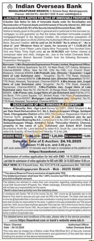 DESCRIPTION OF THE IMMOVABLE PROPERTY : Nature of Security: Non-Agri Land Survey No 290/1, 289/2 Situated In As per Sale Deed-Demarcation 6-C, No.3, Sadayankuppam Village, Saidapet Taluk, Chengalpattu District within SRO Thiruvottiyur, Registration District of Chennai North, property in the name of Late Dulichand Jain As per Mortgage Deed-Bearing No.6-C, Comprised in S.No.290/1 and 289/2 of No.3. Sadayankuppam Village, Ambattur Taluk, Thiruvallur District, Chennai, property in the name of Late Dulichand Jain Extent 40.01 Cents Boundaries North By: Land denoted by letter 6-D, South By: Land denoted by letter 6-B, East By: 40 feet Road and West By: R.S.No.286.