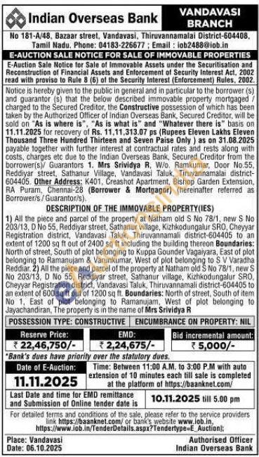 DESCRIPTION OF THE IMMOVABLE PROPERTY(IES) : 1) All the piece and parcel of the property at Natham old S No 78/1, new S No 203/13, D No 55, Reddiyar street, Sathanur village, Kizhkodungalur SRO, Cheyyar Registration district, Vandavasi Taluk, Thiruvannamali district-604405 to an extent of 1200 sq ft out of 2400 sq ft including the building thereon Boundaries: North of street, South of plat belonging to Kuppa Gounder Vagaiyara, East of plot belonging to Ramanujam & Varunkumar, West of plot belonging to S V Varadha Reddiar. 2) All the piece and parcel of the property at Natham old S No 78/1, new S No 203/13, D No 55, Reddiyar street, Sathanur village, Kizhkodungalur SRO, Cheyyar Registration district, Vandavasi Taluk, Thiruvannamali district-604405 to an extent of 600 sq ft out of 1200 sq ft. Boundaries: North of street, South of item No 1, East of plot belonging to Ramanujam, West of plot belonging to Jayachandiran, The property is in the name of Mrs Srividya R