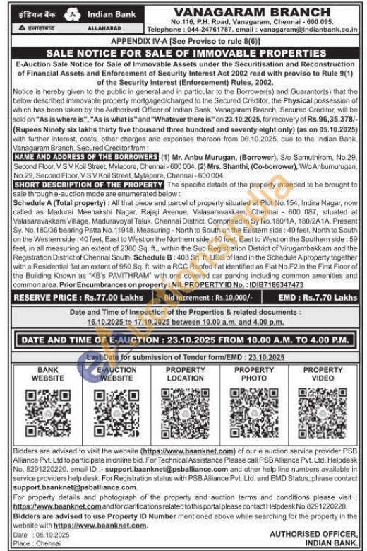 Schedule A (Total property): All that piece and parcel of property situated at Plot No. 154, Indira Nagar, now called as Madurai Meenakshi Nagar, Rajaji Avenue, Valasaravakkam, Chennai 600 087, situated at Valasaravakkam Village, Maduravoyal Taluk, Chennai District. Comprised in Sy No. 180/1A, 180/2A1A, Present Sy. No. 180/36 bearing Patta No. 11948. Measuring - North to South on the Eastern side: 40 feet, North to South on the Western side: 40 feet, East to West on the Northern side: 60 feet, East to West on the Southern side: 59 feet, in all measuring an extent of 2380 Sq. ft., within the Sub Registration District of Virugambakkam and the Registration District of Chennal South. Schedule B: 403 Sq. ft. UDS of land in the Schedule A property together with a Residential flat an extent of 950 Sq. ft. with a RCC Roofed flat identified as Flat No.F2 in the First Floor of the Building Known as "KB's PAVITHRAM with one covered car parking including common amenities and common area. Prior Encumbrances on property: Nil. PROPERTY ID No.: IDIB7186347473