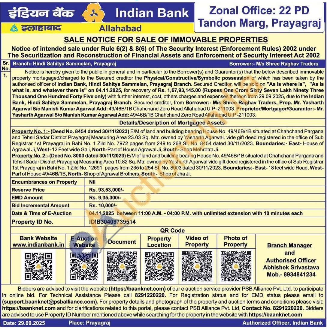 Property No. 1:- (Deed No. 8454 dated 30/11/2023) E/M of land and building bearing House No. 49/46B/1B situated at Chahchand Pargana and Tehsil Sadar District Prayagraj Measuring Area 23.03 Sq. Mtr. owned by Yasharth Agarwal. vide gift deed registered in the office of Sub Registrar 1st Prayagraj in Bahi No. 1 Zild No. 7972 pages from 249 to 268 SI. No. 8454 dated 30/11/2023. Boundaries:- East- House of Agrawal Ji, West-12 Feet wide Gali, North-Part of House Agrawal Ji, South-Shop Mehrotra Ji. Property No. 2:- (Deed No. 8003 dated 30/11/2023) E/M of land and building bearing House No. 49/46B/1B situated at Chahchand Pargana and Tehsil Sadar District Prayagraj Measuring Area 10.82 Sq. Mtr. owned by Yasharth Agarwal vide gift deed registered in the office of Sub Registrar 1st Prayagraj in Bahi No. 1 Zild No. 12691 pages from 235 to 254 SI. No. 8003 dated 30/11/2023. Boundaries:-East-18 feet wide Road, West-Part of House 49/46B/1B, North-Shop of Agrawal Brothers, South- Shop of Jha Ji.
