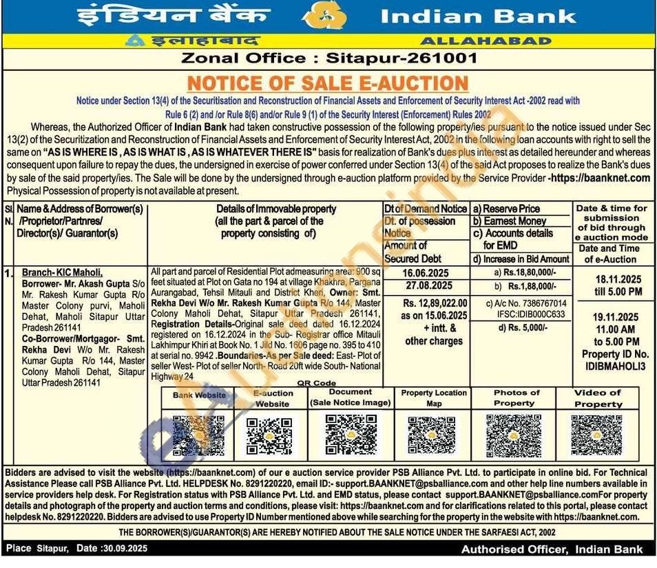 All part and parcel of Residential Plot admeasuring area: 900 sq feet situated at Plot on Gata no 194 at village Khakhra, Pargana Aurangabad, Tehsil Mitauli and District Kheri, Owner: Smt. Rekha Devi W/o Mr. Rakesh Kumar Gupta R/o 144, Master Colony Maholi Dehat, Sitapur Uttar Pradesh 261141, Registration Details-Original sale deed dated 16.12.2024 registered on 16.12.2024 in the Sub- Registrar office Mitauli Lakhimpur Khiri at Book No. 1 Jild No. 1606 page no. 395 to 410 at serial no. 9942. Boundaries-As per Sale deed: East- Plot of seller West-Plot of seller North-Road 20ft wide South- National Highway 24