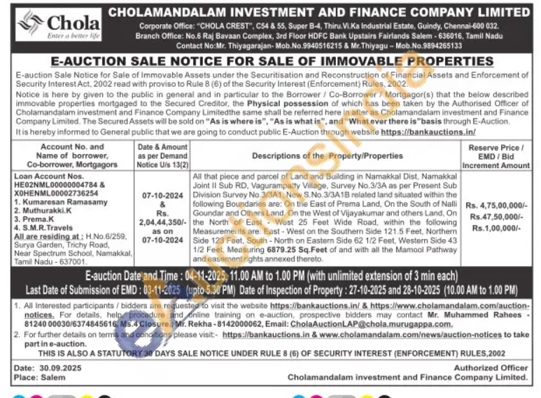 All that piece and parcel of Land and Building in Namakkal Dist, Namakkal Joint II Sub RD, Vagurampatty Village, Survey No.3/3A as per Present Sub Division Survey No. 3/3A1, New S.No.3/3A1B related land situated within the following Boundaries are: On the East of Prema Land, On the South of Nalli Goundar and Others Land, On the West of Vijayakumar and others Land, On the North of East West 25 Feet Wide Road, within the following Measurements are: East-West on the Southern Side 121.5 Feet, Northem Side 123 Feet, South - North on Eastern Side 62 1/2 Feet, Western Side 43 1/2 Feet, Measuring 6879.25 Sq. Feet of and with all the Mamool Pathway and easement rights annexed thereto.