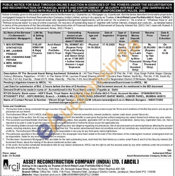 Description Of The Secured Asset Being Auctioned: Schedule A: All That Piece And Parcel Of Plot No. F-60, Vijay Singh Pathik Nagar (Sanjay Colony) Bhilwara, Rajasthan-311001. In The Name Of Mr. Laxman Prasad Sharma And Mr. Chandra Ram Pathak. North By: Plot No. F-59, South By: Plot No. F-61-62, East By: Road 20 Ft. Wide, West By: Plot No. F-55. And Situated Within The Registration District Of Bhilwara, Rajasthan.