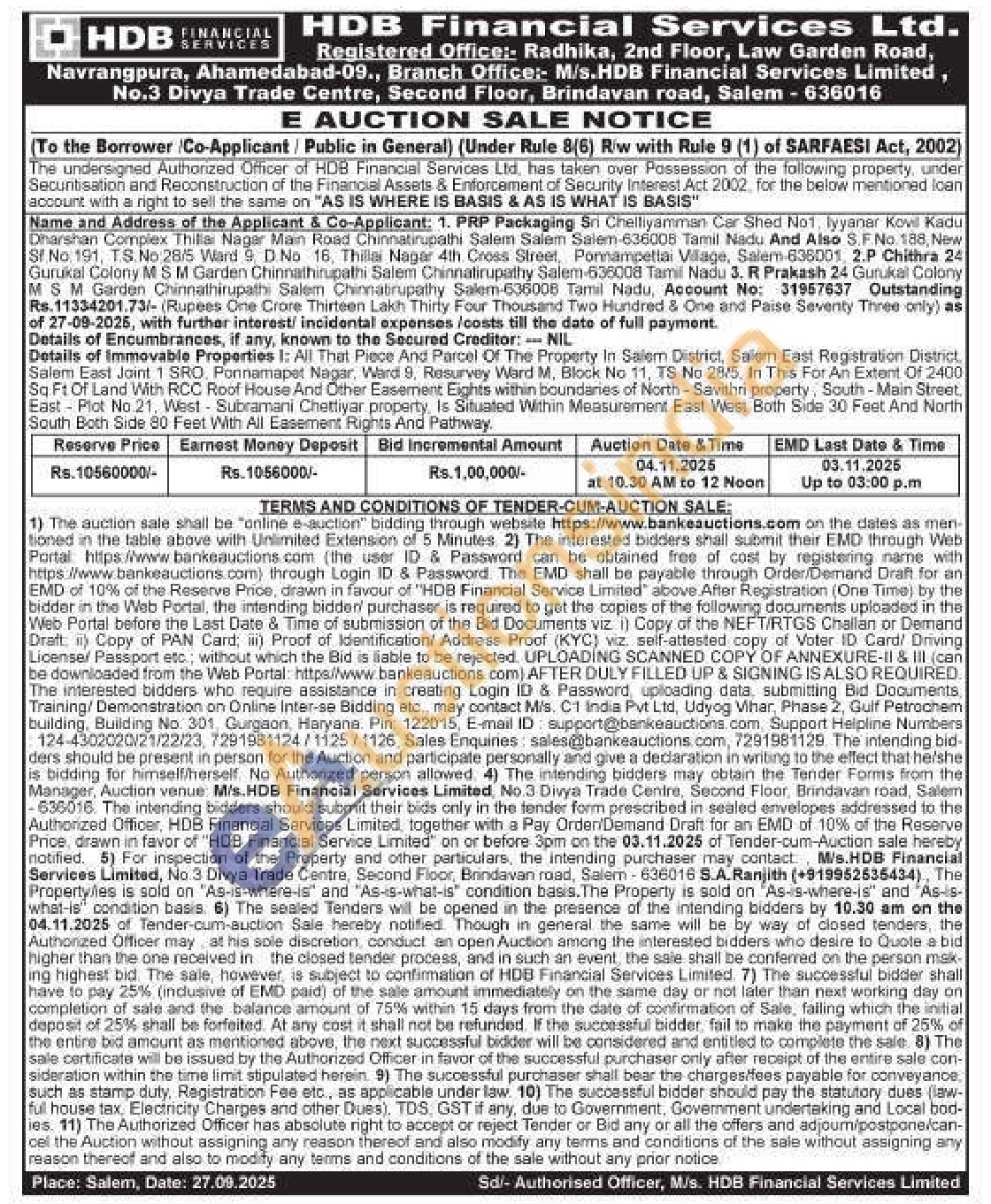 Details of Immovable Properties I: All That Piece And Parcel Of The Property In Salem District, Salerm East Registration District Salem East Joint 1 SRO. Ponnamapet Nagar, Ward 9, Resurvey Ward M. Block No 11, TS No 28/5, In This For An Extent Of 2400 Sq Ft Of Land With RCC Roof House And Other Easement Eights within boundaries of North-Savithri property, South - Main Street East-Plot No 21, West-Subramani Chettiyar property, Is Situated Within Measurement East West Both Side 30 Feet And North South Both Side 80 Feet With All Easement Rights And Pathway.