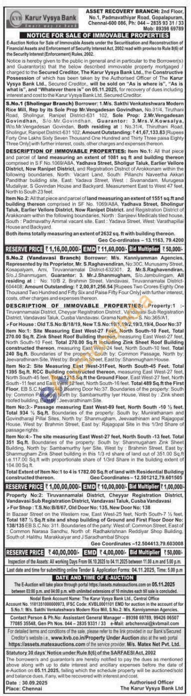 DESCRIPTION OF IMMOVABLE PROPERTIES: Property:1:- Tiruvannamalai District, Cheyyar Registration District, Vandavasi Sub Registration District Vandavası Taluk, Cusba Vandavasi, Grama Natham-S. No:365/A1, For House: Old T.S.No:8/18/19, New T.S.No:19/1,19/2,19/3,19/4, Door No:37 Item No:1: Site Measuring East West-27 Feet, North South-10 Feet, Total 270.00 Sq.ft. Zink Sheet Roof Building thereon, measuring East West-27 feet, North South-10 Feet Total 270.00 Sq.ft including Zink Sheet Roof Building constructed thereon, measuring East West-24 feet, North South-10 feet. Total 240 Sq.ft. Boundaries of the property: South by: Common Passage, North by: Jeevarathinam Site, West by: Brahmin Street, East by: Shanmugham House Item No:2: Site. Measuring East West-31Feet, North South-45 Feet. Total 1395 Sq.ft. RCC Building constructed thereon, measuring East West-27 feet, North South-45 feet, Total 1215 Sq.ft the Ground Floor, East West-27 feet, North South-11 feet and East West 12 feet, North South-16 feet. Total 489 Sq.ft the First Floor, EB S.C. No: 1/1443 Bearing Door No:37. Boundaries of the property: South by: Common Passage, North by: Sambamurthy lyer House, West by: Zink sheet roofed building, East by: Jeevarathinam Site Item No:3:- Passage measuring East West-89 feet, North South -10% feet. Total 934% Sq.ft. Boundaries of the property. South by: Munirathanam and Govindharaji Pillai Sites, North by: Shanmugham, Jeevaathinam and Rajagopal House, West by: Brahmin Street, East by: Rajagopal Site in this 1/3rd Share of passage rights.