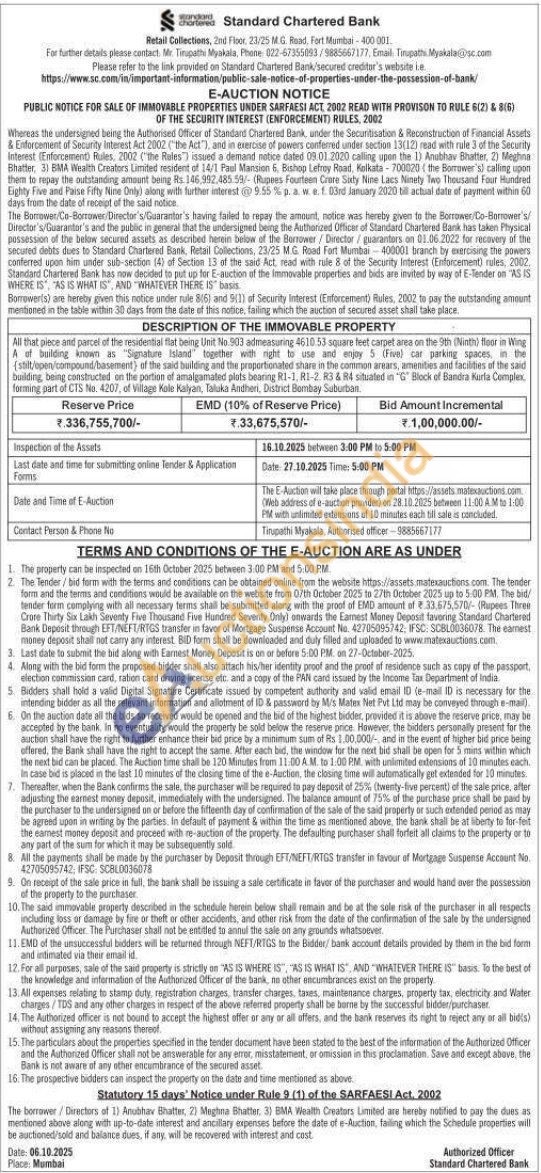 All that piece and parcel of the residential flat being Unit No.903 admeasuring 461053 square feet carpet area on the 9th Ninth floor in Wing A of building known as "Siprature Island together with right to use and enjoy 5 (Five) car parking spaces, in te (stit/open/compound/basement) of the said building and the proportionated share in the common arears, anentes and facilities of the said building being constructed on the portion of amalgamated plots bearing R1-1, R1-2 R3684 situated in "G" Block of Bandra Kurta Complex forming part of CTS No. 4207, of Village Hole Kalyan, Taluka Andheri, District Bembay Suburbas